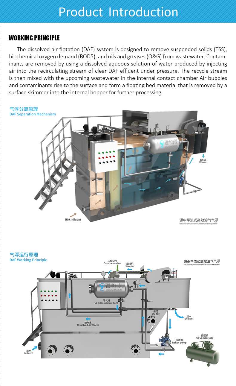 Dissolved Air Flotation is a solid/liquid or liquid/liquid separation process to remove tiny suspended solids that density close to water,colloid,oil and grease etc.